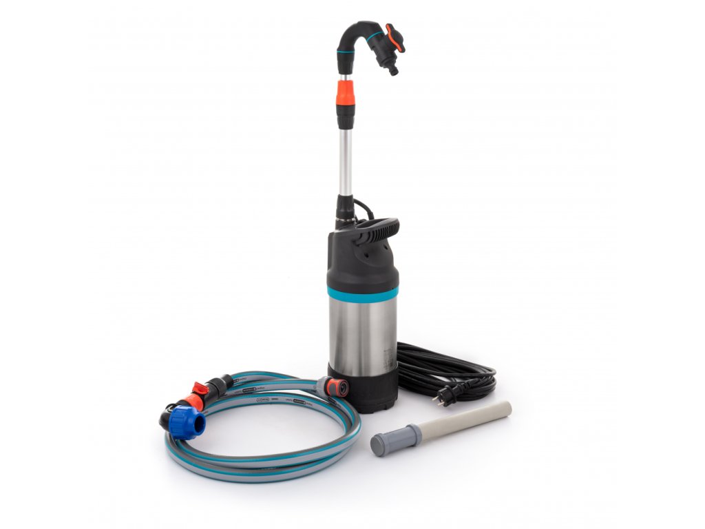 Čerpací systém obsahuje ponorné čerpadlo GARDENA s káblom 10 m, výtlačnou hadicou a spojkami GARDENA.