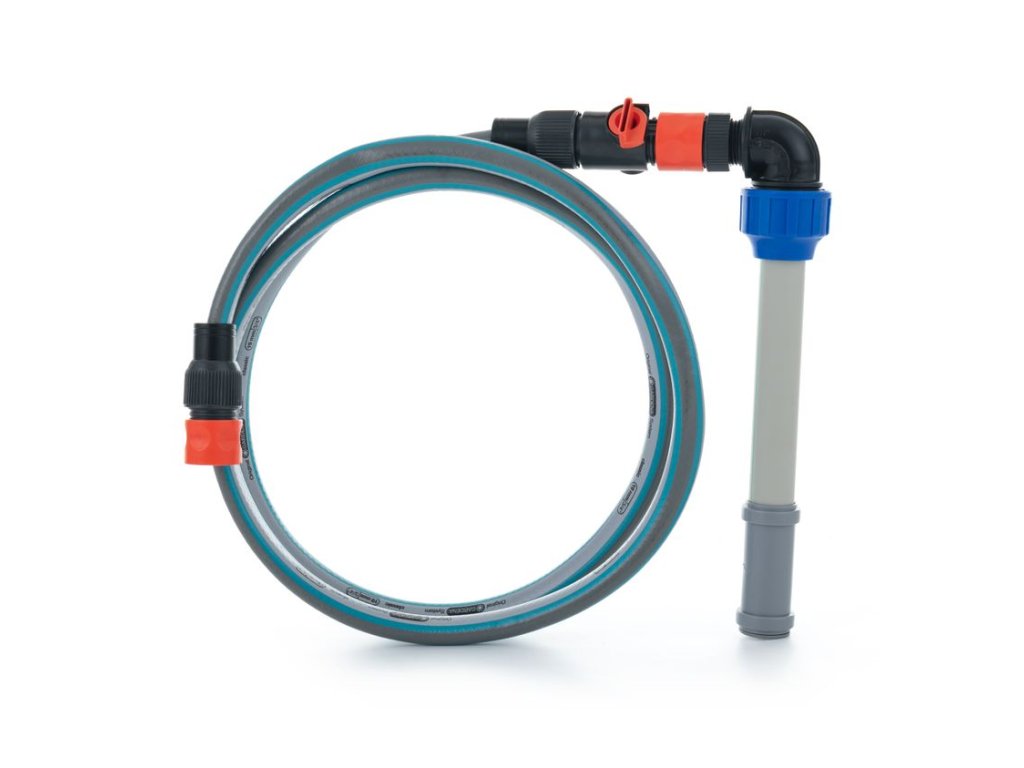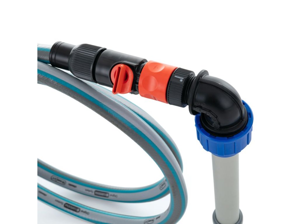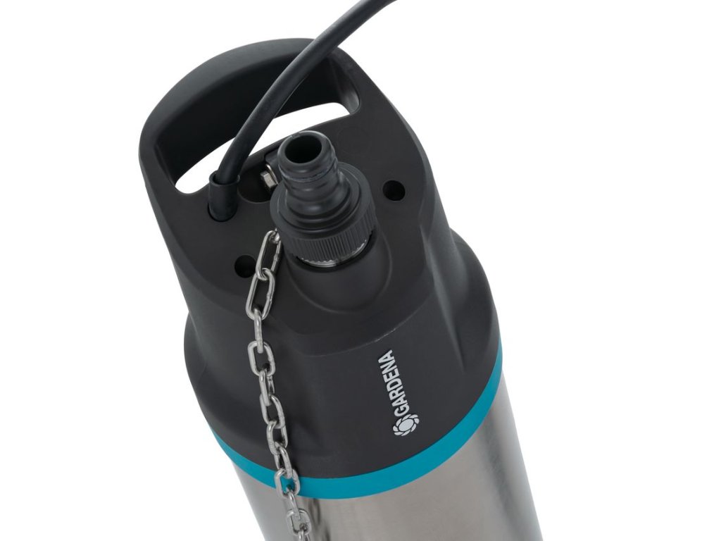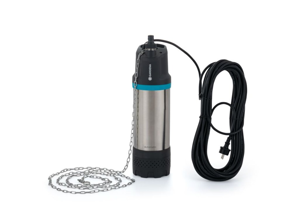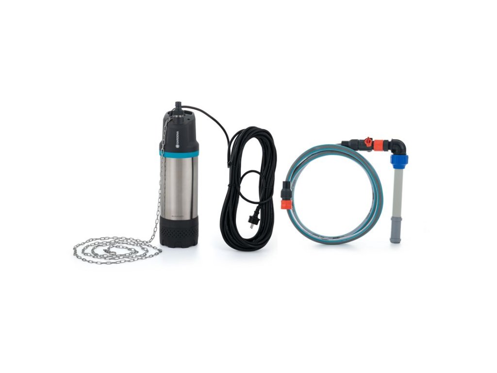 Ponorné čerpadlo GARDENA, mimoriadne dlhý kábel 20 m, výtlačná hadica a spojky GARDENA. S týmto čerpacím systémom môžete voliteľne použiť Plávajúci sací Vodník (používa sa, pokiaľ môže dochádzať k tvorbe sedimentov na dne nádrže).