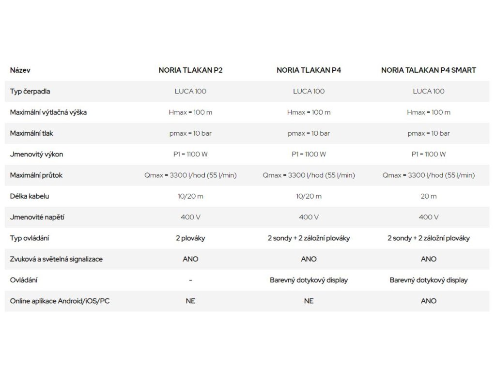 Vysoko výkonný čerpací systém NORIA TLAKAN P4 obsahuje robustné celonerezové kalové čerpadlo LUCA - 100 400V s integrovaným rezacím zariadením s výbornou odolnosťou proti upchávaniu, farebný ovládací dotykový displej, riadiacu jednotku s prúdovým chráničom, zvukovou a svetelnou signalizáciou poruchy, nerezovou PE spojmi a potrubím. Výška čerpania je až 100 m, rýchlosť čerpania až 55 l/min.