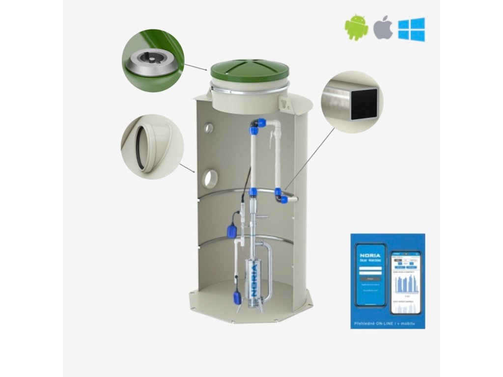 Vystrojená čerpacia nádrž sa skladá z telesa nádrže, prechodom na napojenie, vnútorného automatického čerpacieho systému NORIA TLAKAN P4 s riadiacou jednotkou, ľahkého uzamykateľného plastového poklopu, ktorý je možné na základe vašej požiadavky nahradiť poklopom záťažovým.