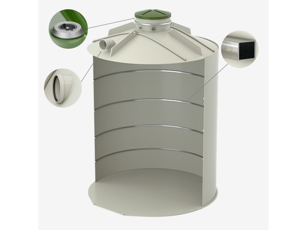 Nádrže novej generácie sú typovo vybavené nátokom a odtokom DN 160 pre ľahké napojenie na kanalizačné potrubie a taktiež technickými priechodkami v komíne 2x DN 32 a 1x DN 75 pre inštaláciu káblovej chráničky alebo pre výtlak z čerpadla či inú aplikáciu.