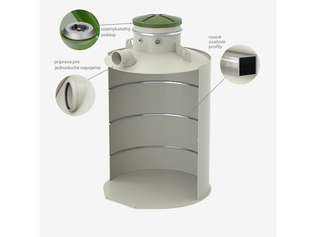 Nádrže novej generácie sú typovo vybavené nátokom a odtokom DN 160 pre ľahké napojenie na kanalizačné potrubie a taktiež technickými priechodkami v komíne 2x DN 32 a 1x DN 75 pre inštaláciu káblovej chráničky alebo pre výtlak z čerpadla či inú aplikáciu.