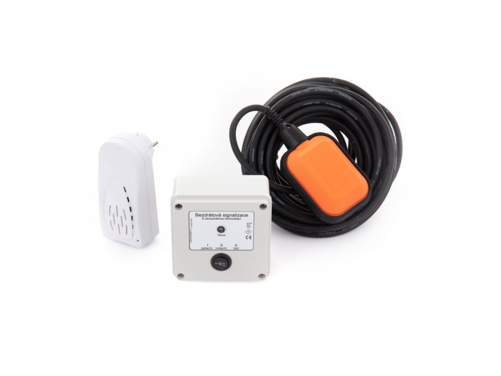 Bezdrôtový systém stráženia stavu hladiny pre upozornenie poruchy čerpadla. Systém sa skladá zo spínacieho plaváka s dĺžkou kábla 10 m, systému uchytenia, signalizačného zariadenia a prijímacej zvukovej stanice s dosahom až 300 m na voľnej ploche.